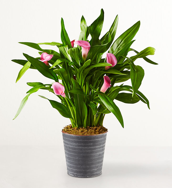 Supple, shapely calla lilies have long been a favorite subject of artists, and when their blossoms are pink, as with this plant, the effect is truly magical. It arrives blooming in a chic slate-and-copper planter, ready to lift the lucky recipient's spirits and brighten their surroundings.